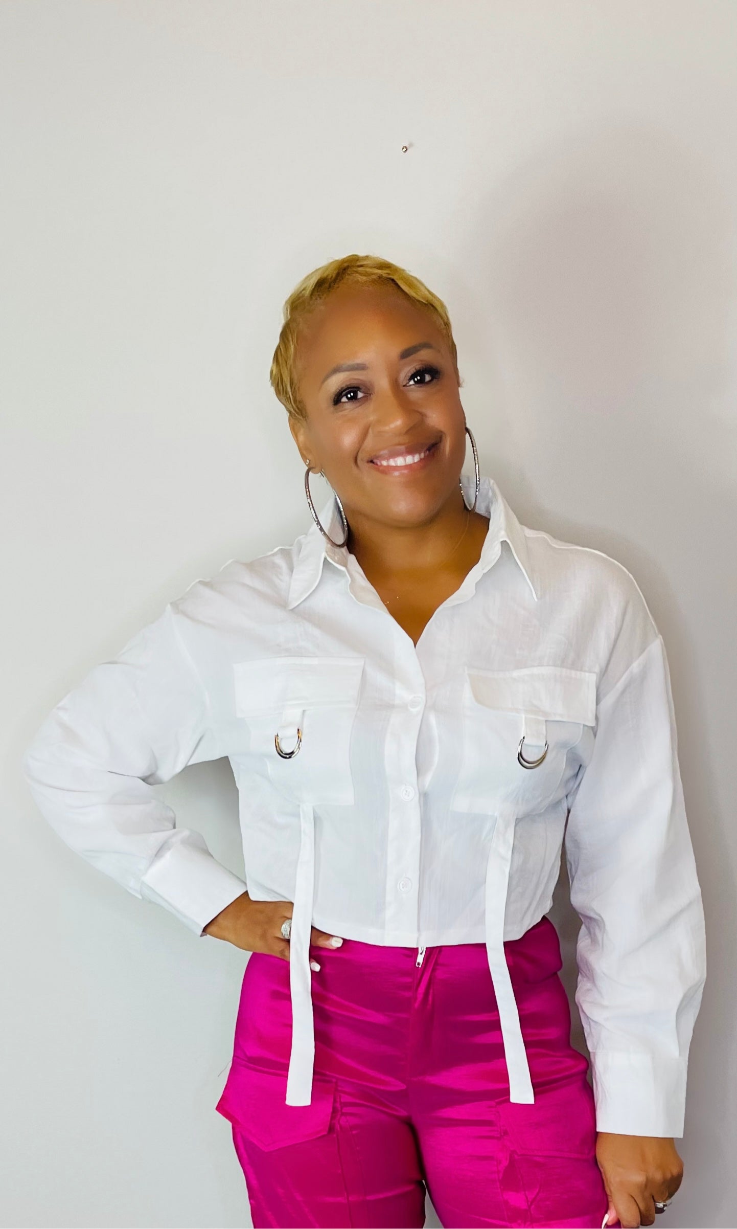 Elevate your style with our Chic Cropped Utility Shirt in crisp white. This modern take on the classic button-down features a cropped silhouette, adding a trendy touch to any outfit. With oversized front pockets adorned with sleek D-ring details, this shirt combines functionality with fashion, making it a must-have for any wardrobe.