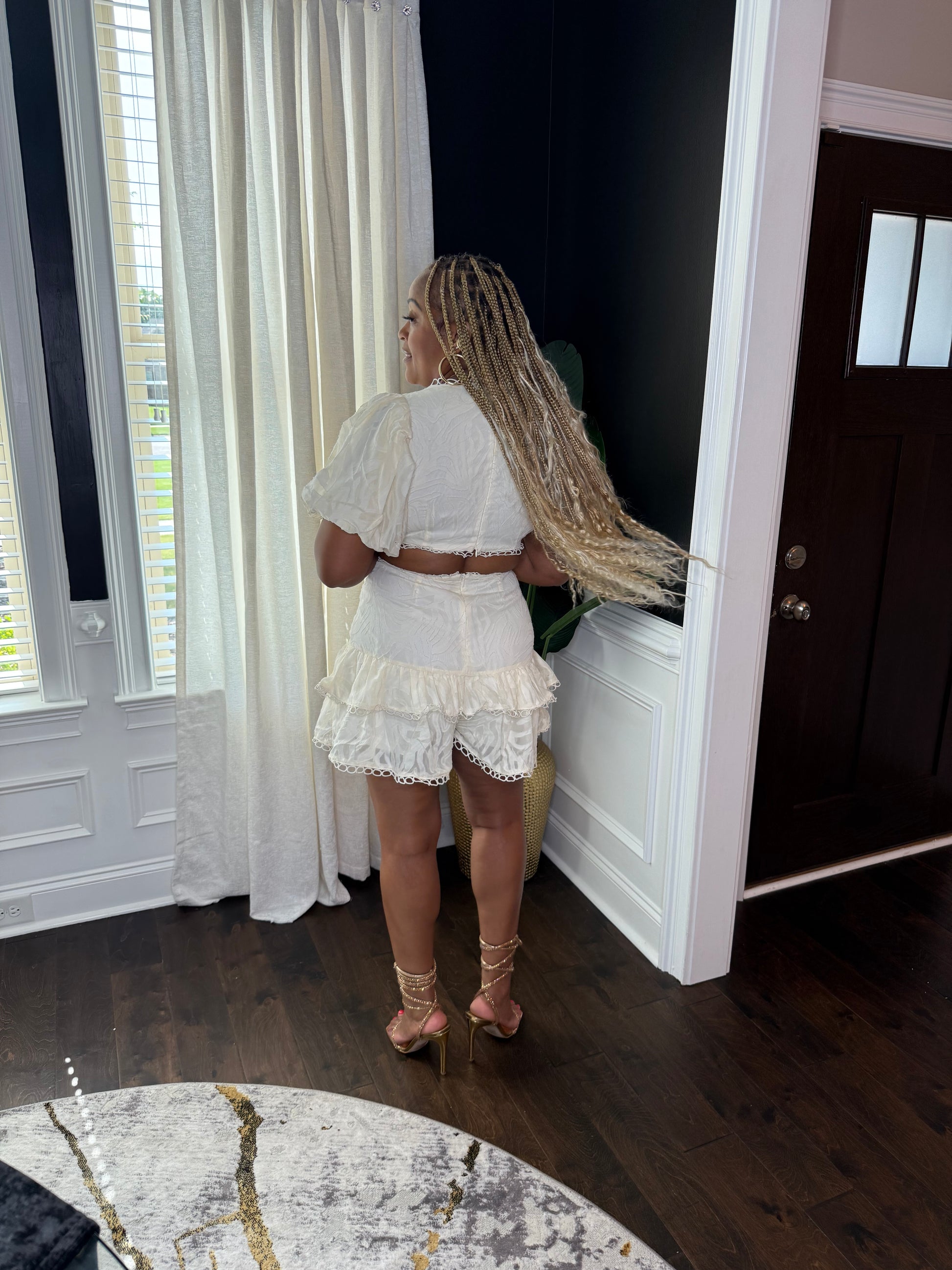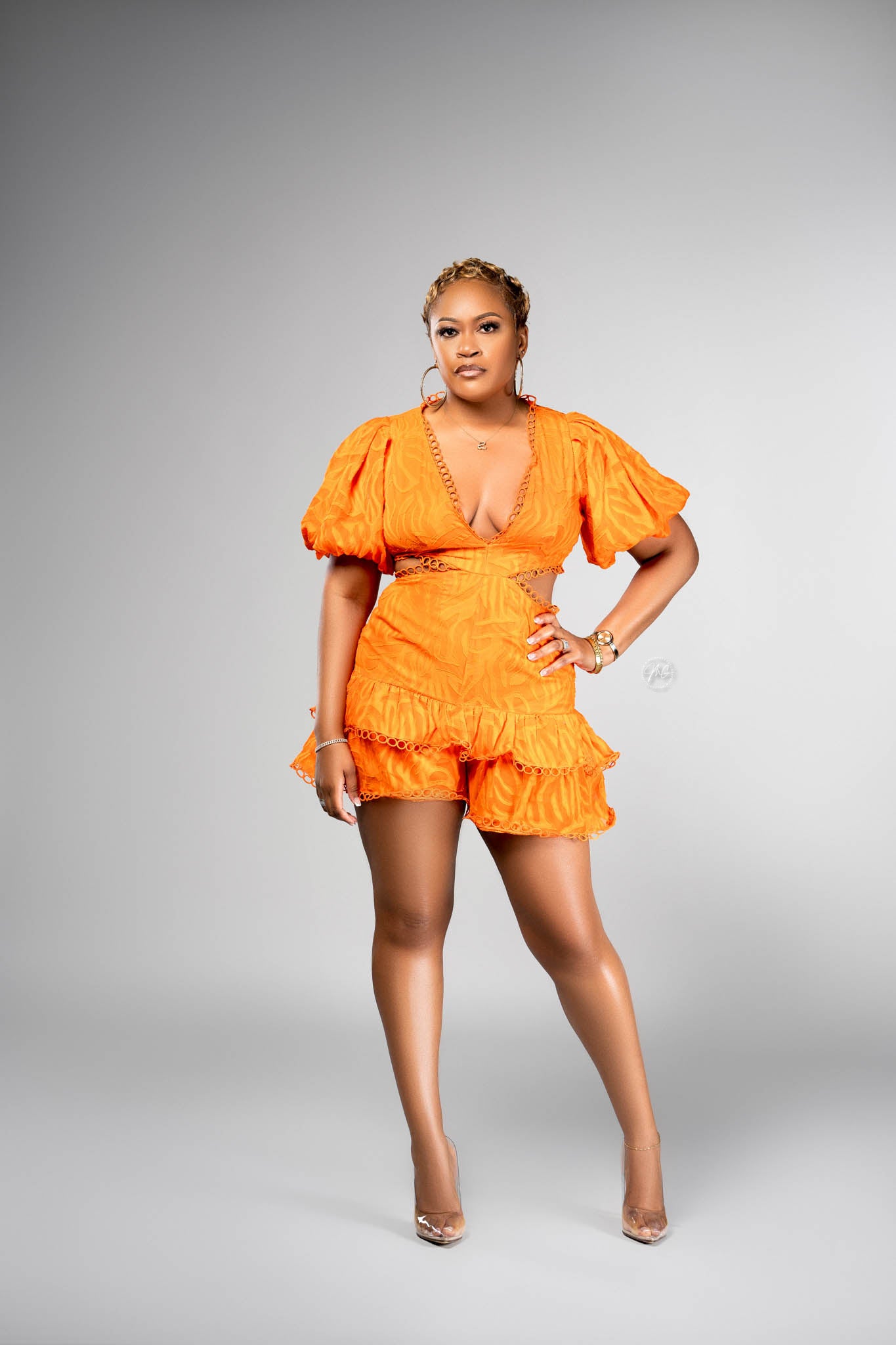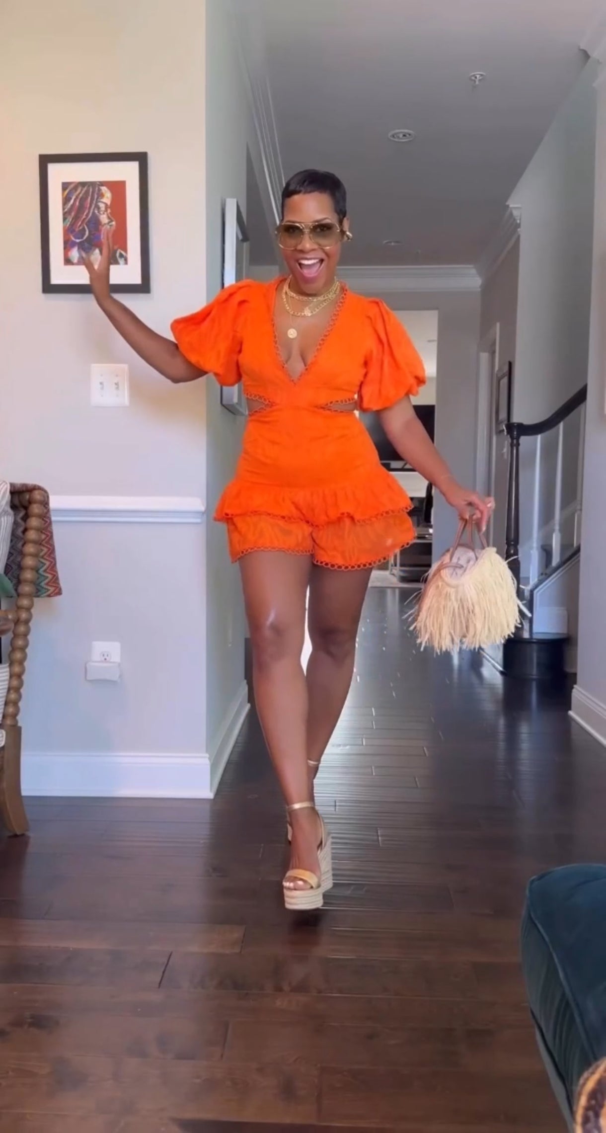Turn heads with our vibrant Orange Lace Trim Puff Sleeve Romper. This eye-catching piece features a bold, intricate textured pattern, perfect for making a statement. The deep V-neckline and strategically placed cutouts add a hint of allure, while the delicate lace trim enhances its feminine charm. The puff sleeves and tiered ruffle shorts create a playful and flirty silhouette, making it ideal for both casual and dressier occasions.