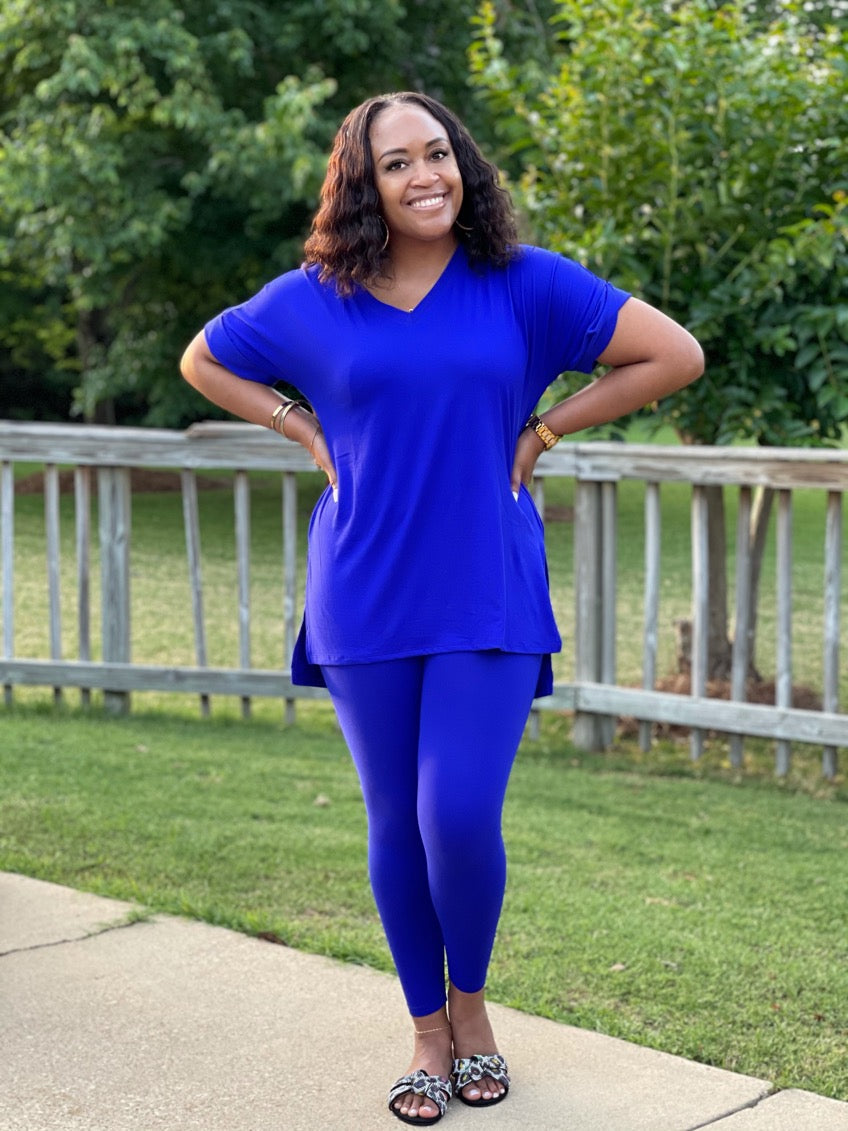 Microfiber loungewear two piece set. Leggings and v-neck blouse with splits on the side. Fits slightly oversized for a comfortable fit. Set has lots of stretch. 90% polyester 10% cotton. Leggings fit high waist. Model is wearing a size small.
