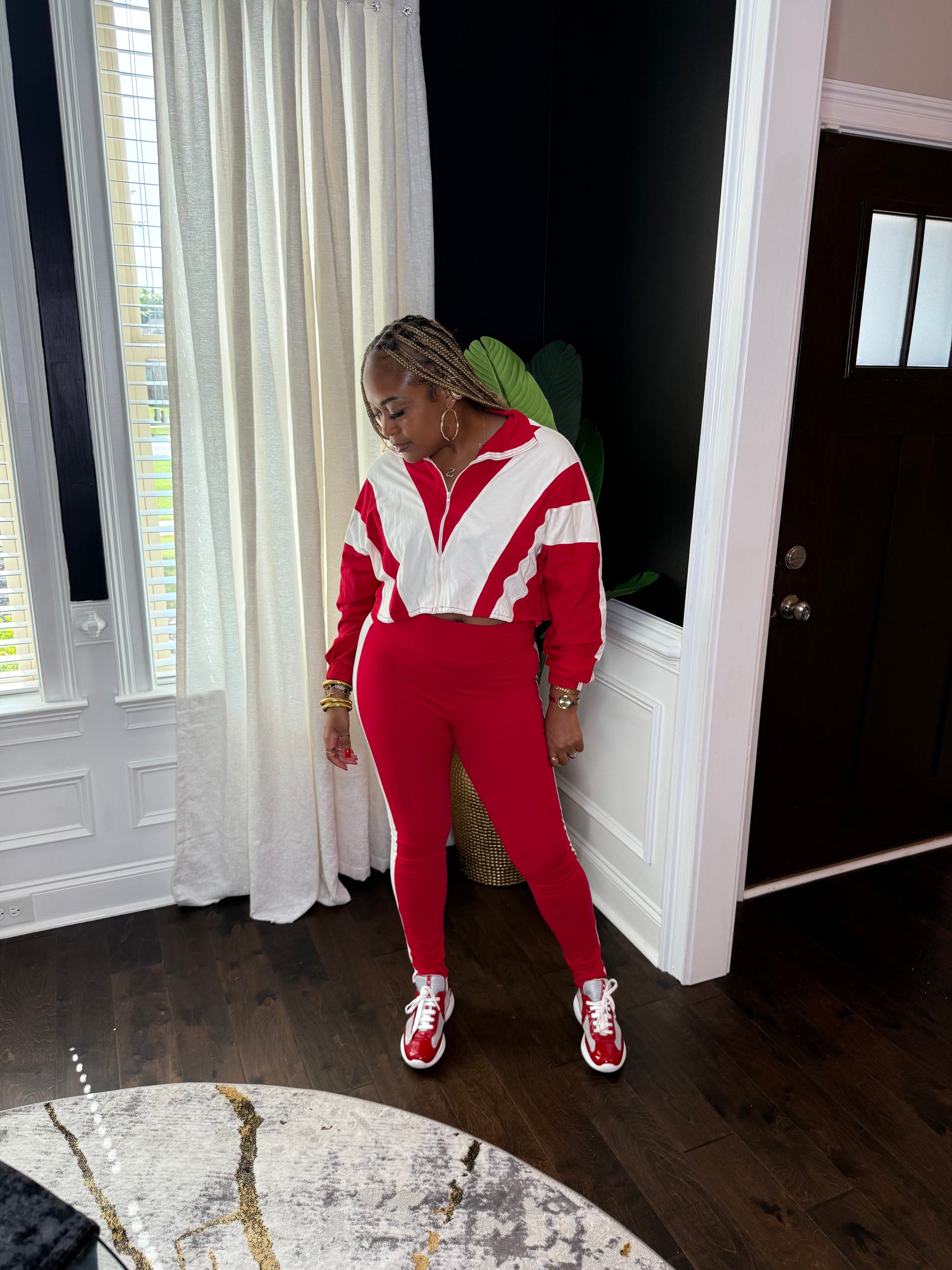 Command attention wherever you go in the Power Play Set – a fierce combo of sporty edge and elevated style. This two-piece set features a cropped zip-up jacket with dramatic balloon sleeves and striking red-and-cream colorblock detailing, perfectly paired with high-waisted, curve-hugging leggings for that confident, boss-babe finish.