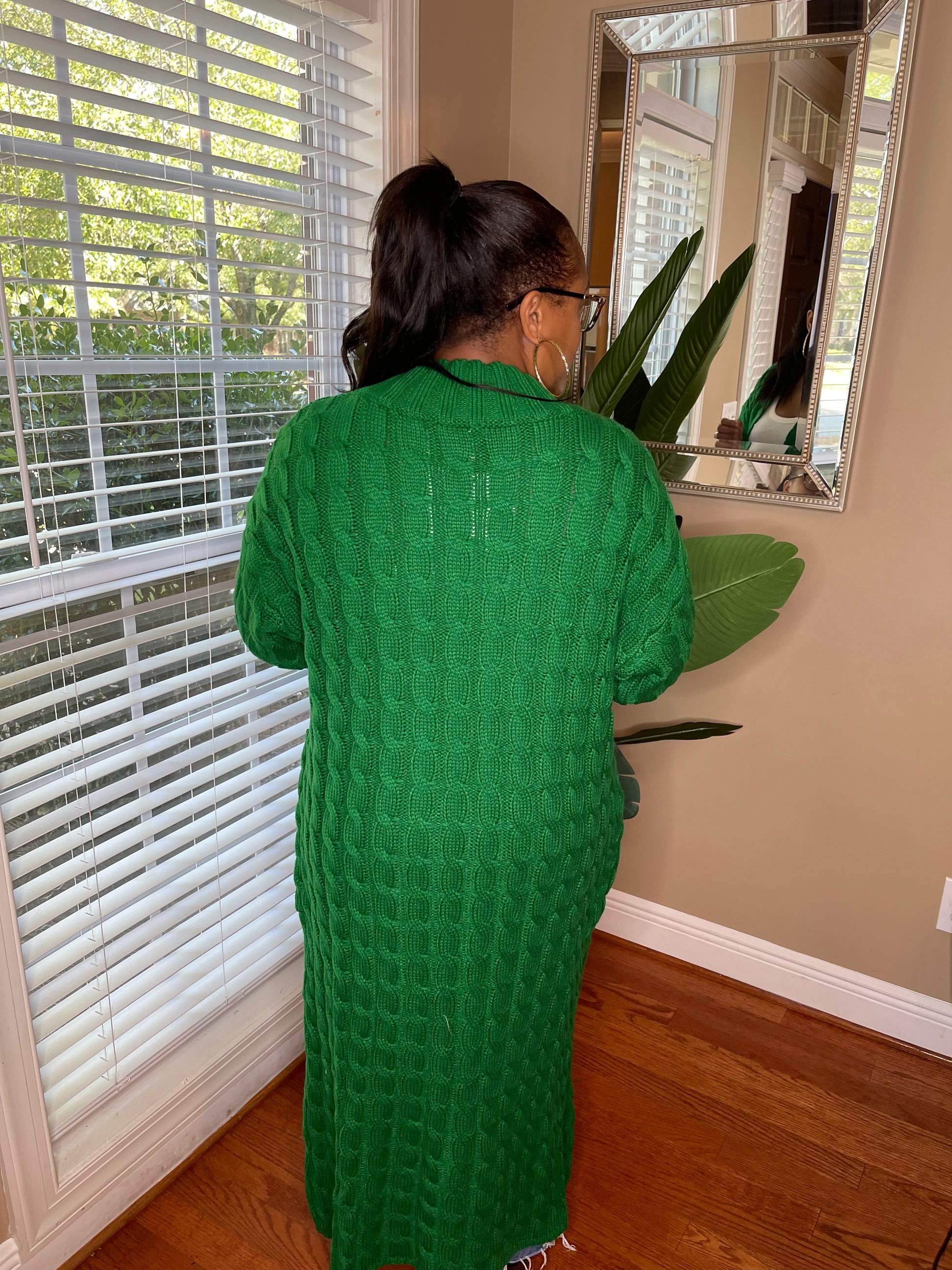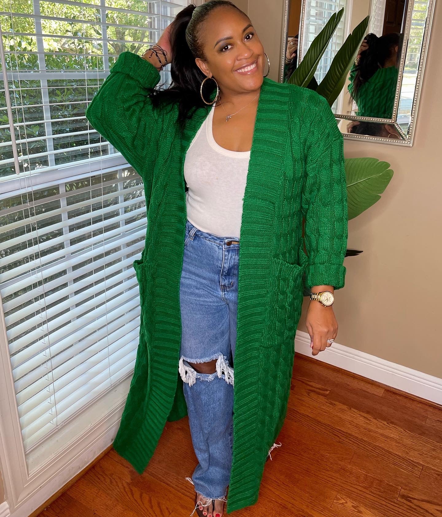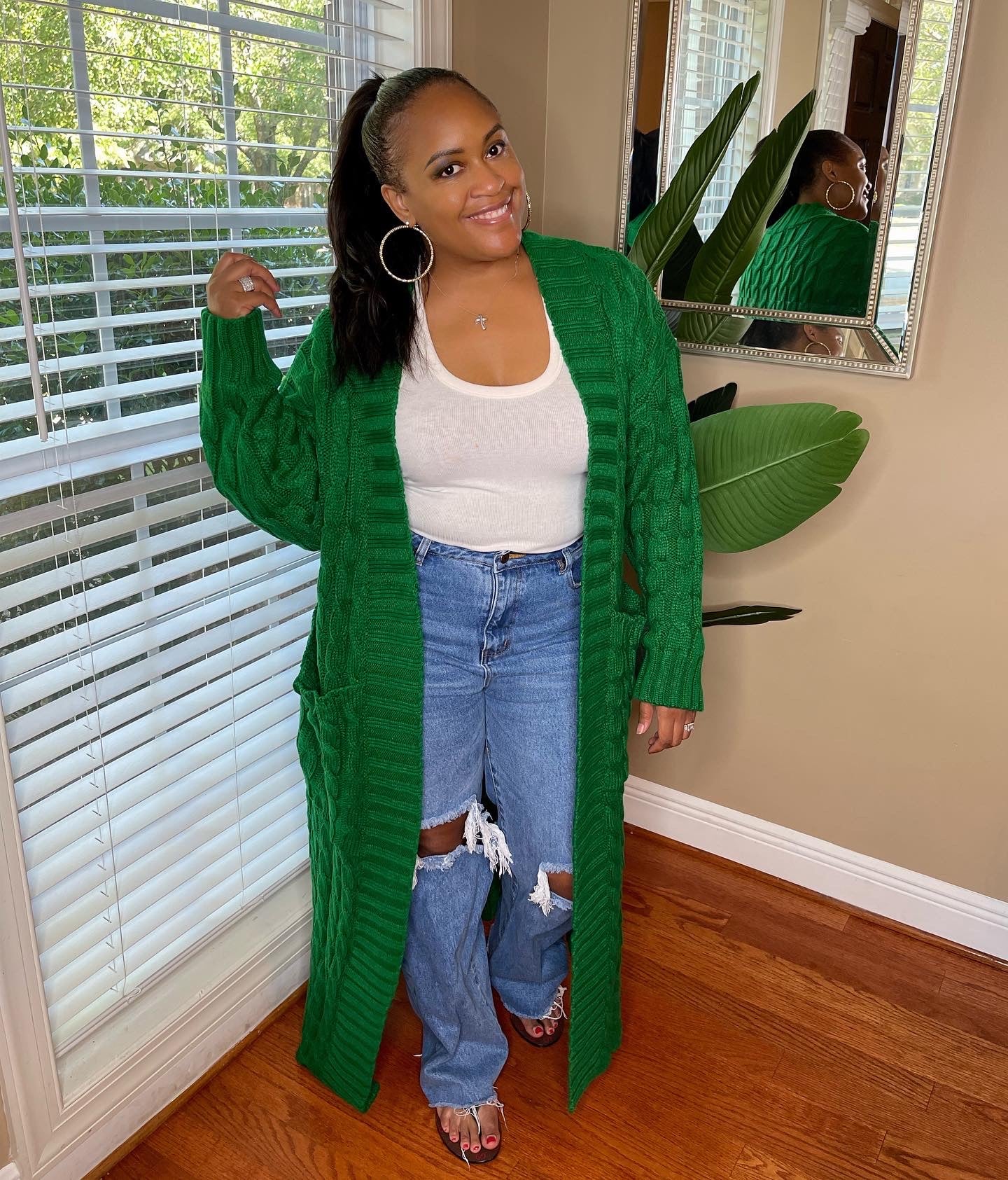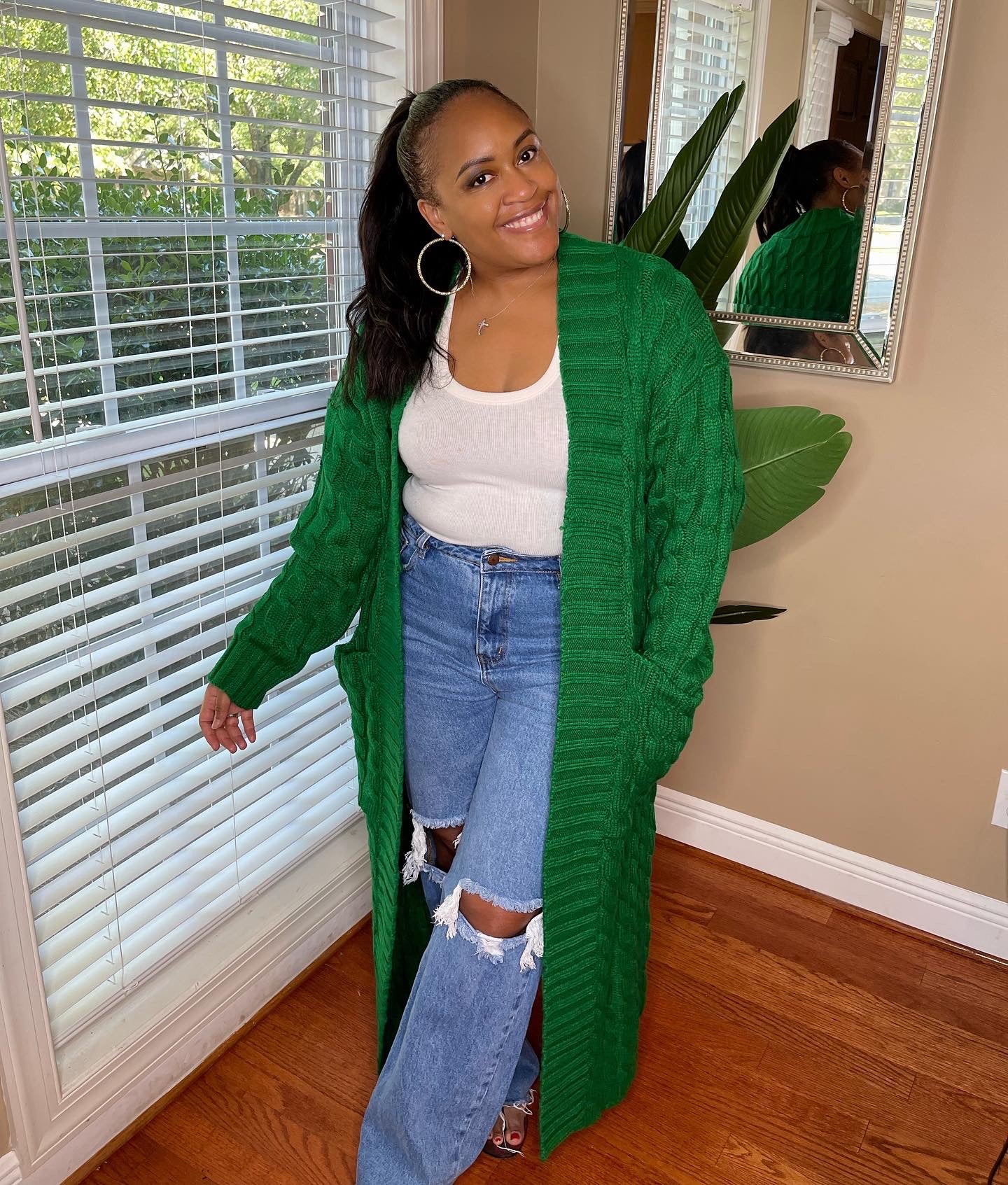 Chunky oversized, ankle length knitted cardigan. Open front with 2 pockets. Very relaxed fit. Model is wearing a size small. The small fits more like a size large, so if you’re normally a size small, unfortunately, this cardigan may be too big for you. Fits oversized.