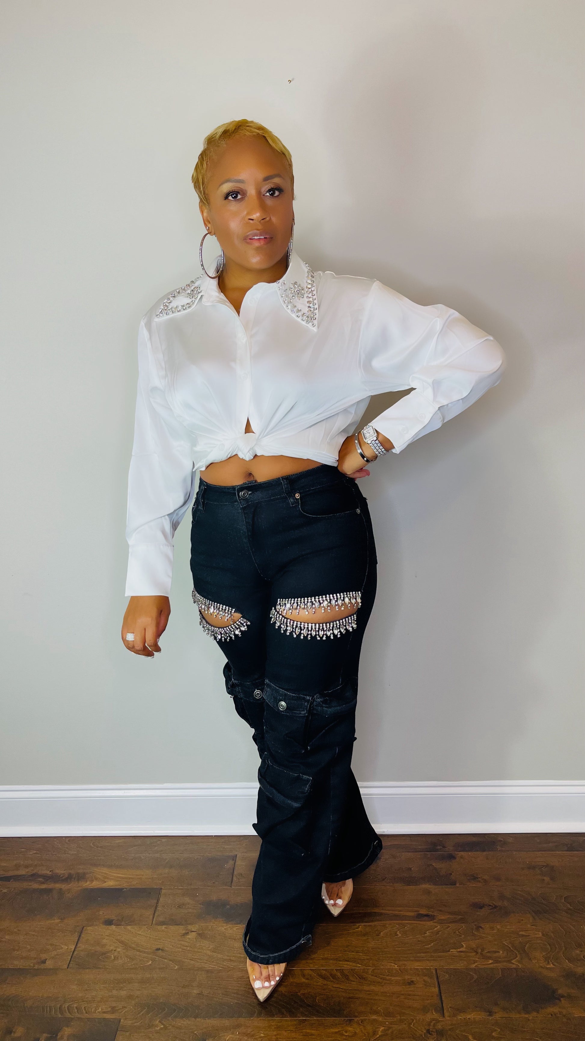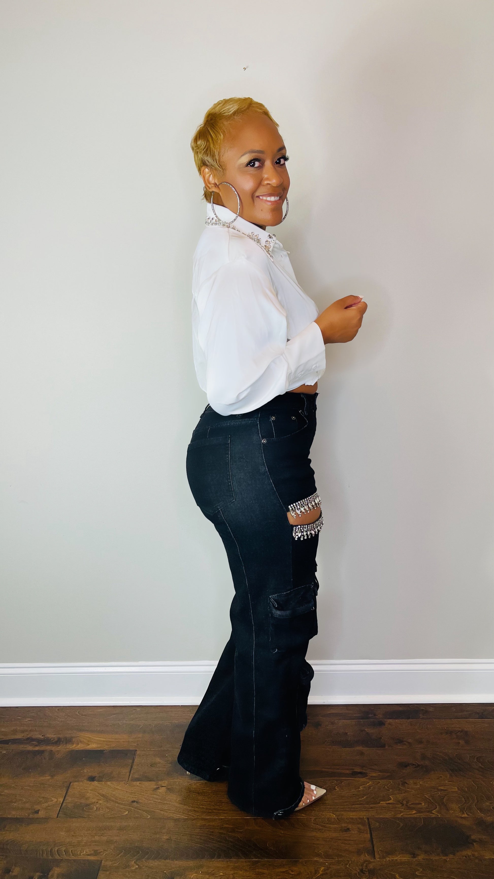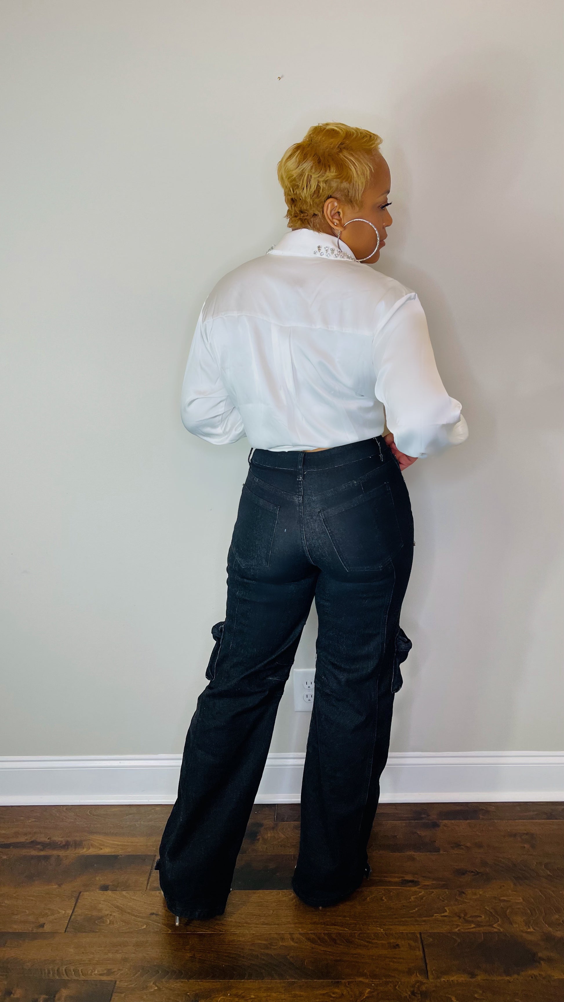 Faites passer votre style cargo au niveau supérieur avec ce jean cargo noir orné de strass ! Le jean présente une ouverture mi-cuisse, ornée de magnifiques strass qui ont une brillance impeccable, ajoutant une touche de féminité et de chic. Le pantalon est taille haute, correspond à la taille et vous épouse aux bons endroits.