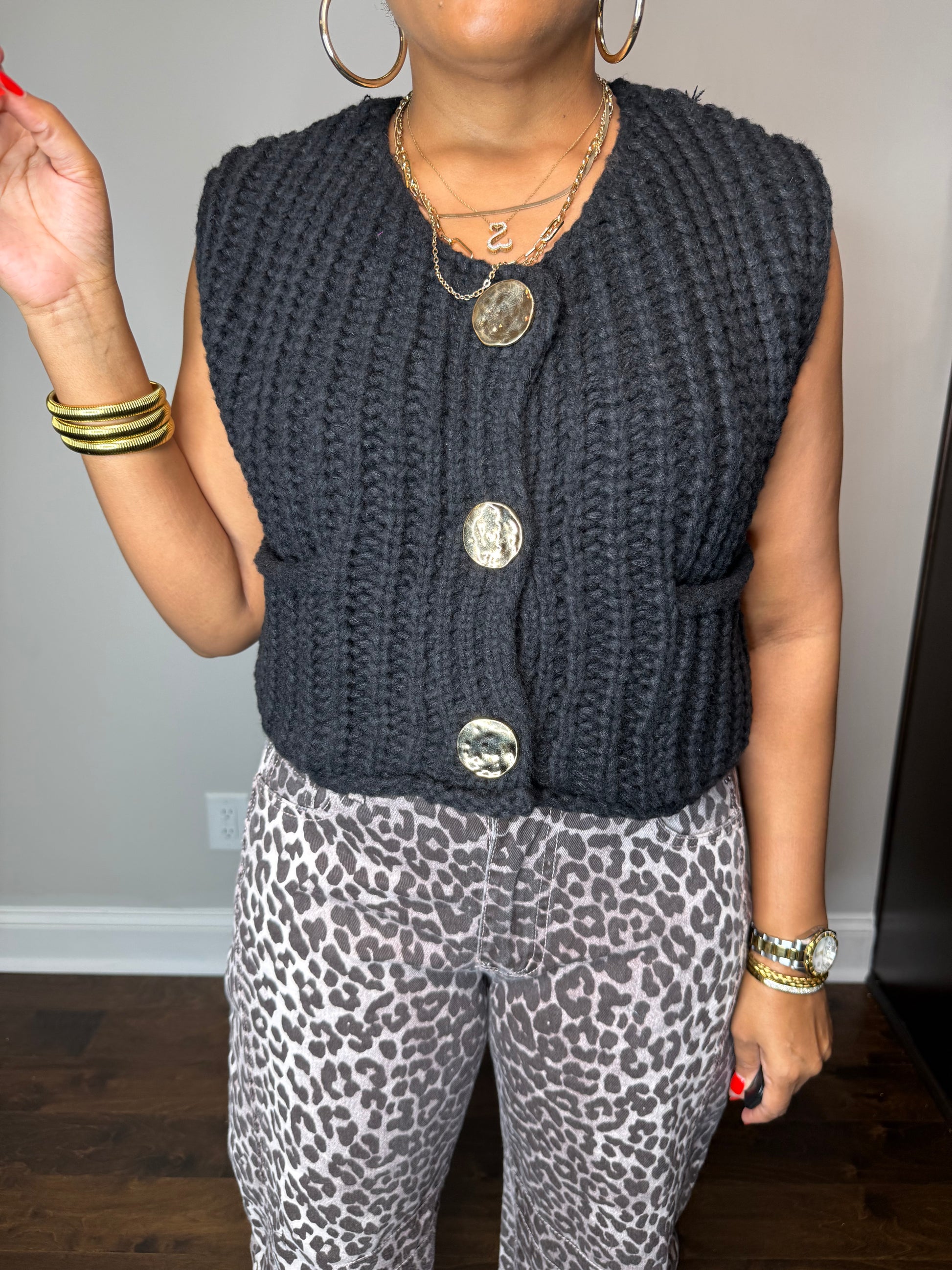Turn heads in our Chunky Knit Vest, the perfect layering piece that combines cozy comfort with bold style. Designed with a relaxed fit, deep V-neckline, and statement gold-tone buttons, this sleeveless vest brings a chic touch to both casual and dressy looks.