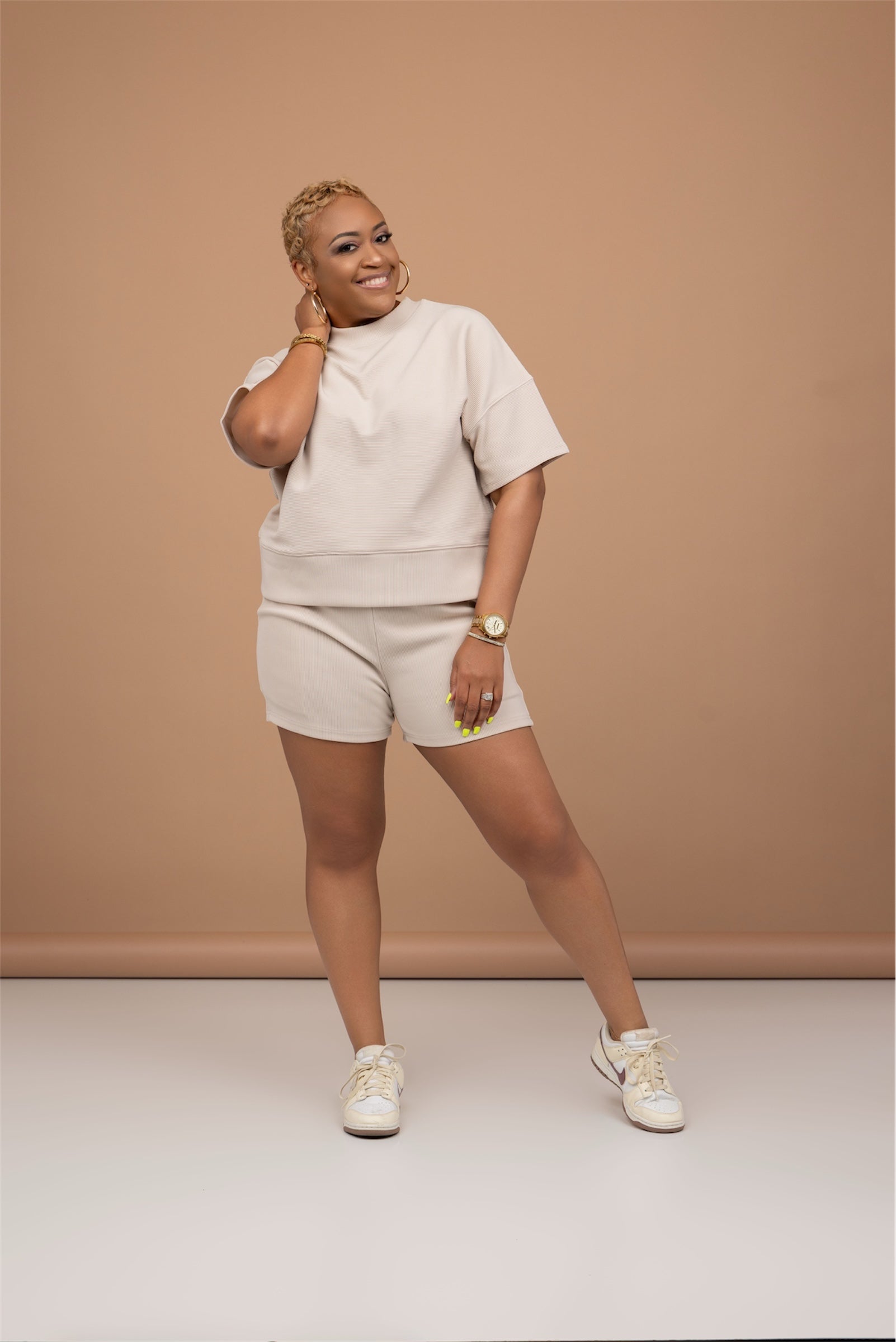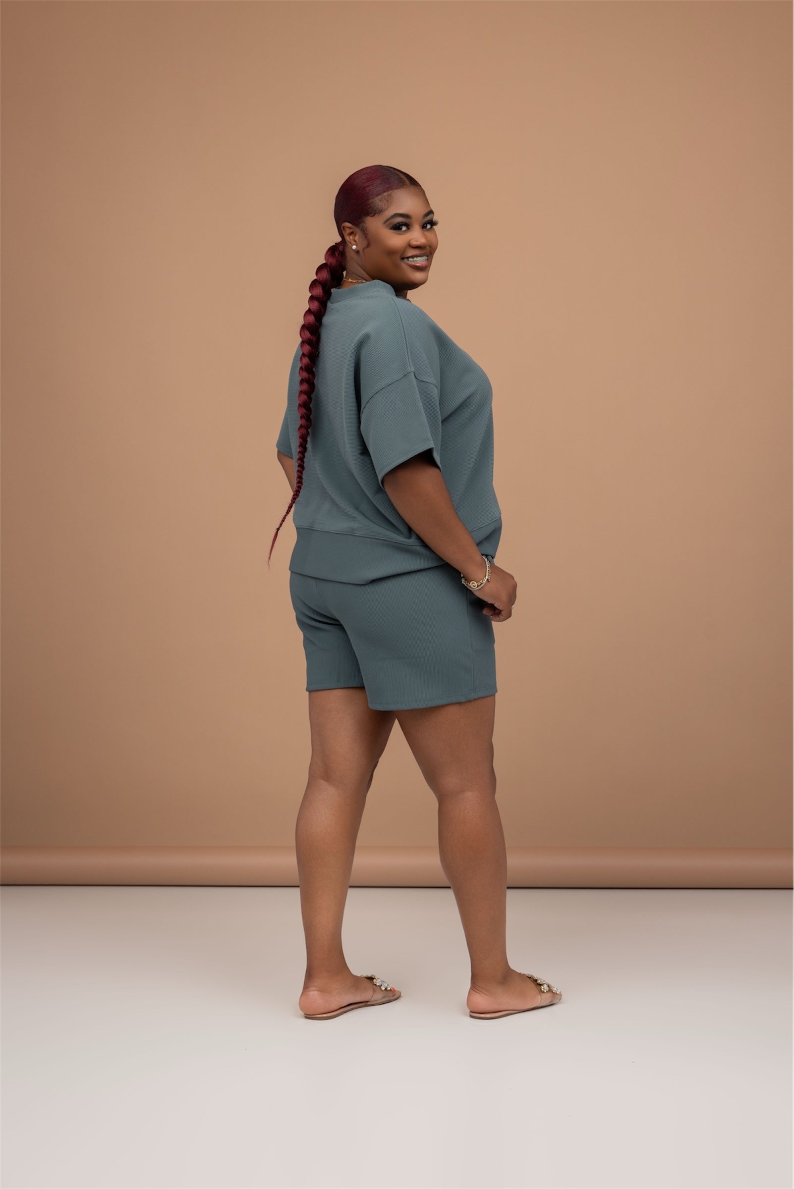 The oversized short-sleeve top offers a relaxed silhouette, perfectly paired with high-waisted shorts that flatter and move with you. Whether you’re exploring the resort, grabbing brunch, or simply unwinding by the pool, this versatile set is your go-to for elevated casual wear.