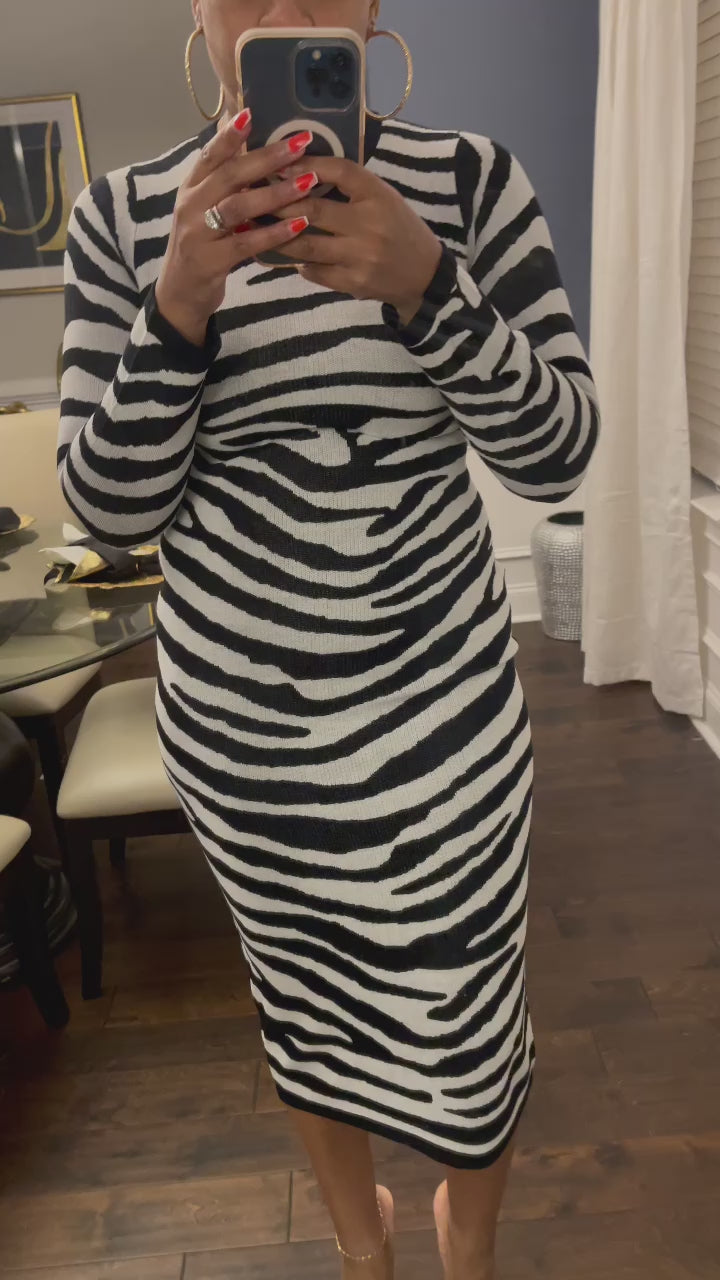 Slip into this must-have Zebra Maxi Sweater Dress and show everyone that you don't mess around when it comes to casual-chic style! Crafted from cozy zebra print fabric, this dress is sure to keep you spot-on fashionable and oh-so-cozy. Fits true to size. Model wearing a size medium.