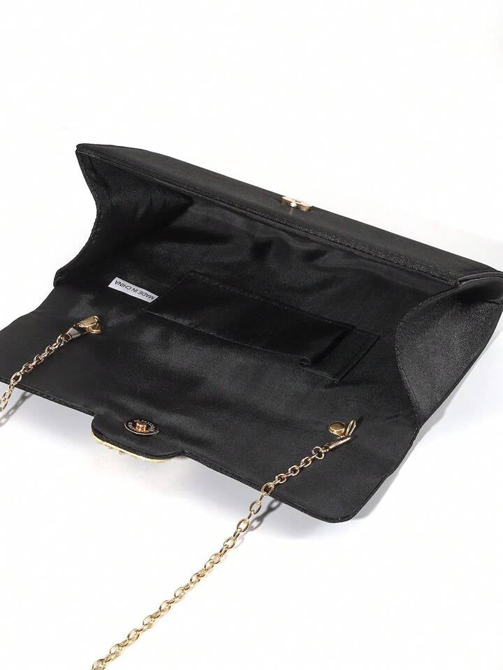 Accessorize with elegance with our classy black Regal Suede clutch featuring faux suede material, a flap closure with snap button and a large rhinestone hoop accent, a removable gold chain link shoulder strap, and a lightweight cylindrical silhouette! The perfect accessory for your next formal event.