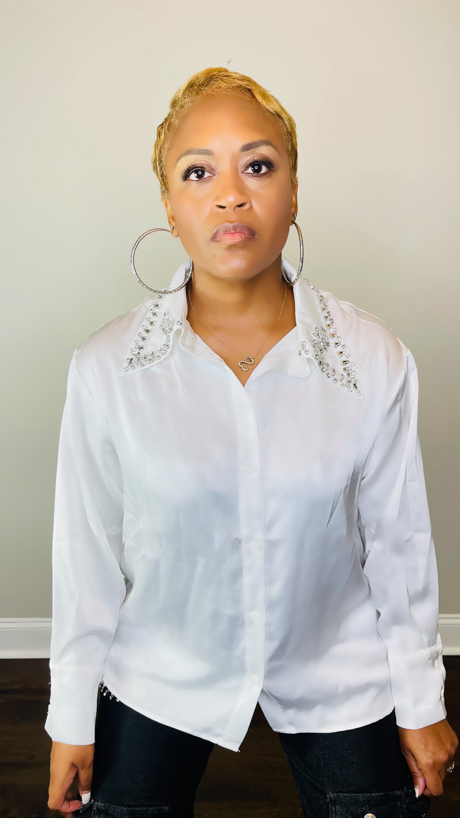 Satin Shirt with Rhinestone Collar