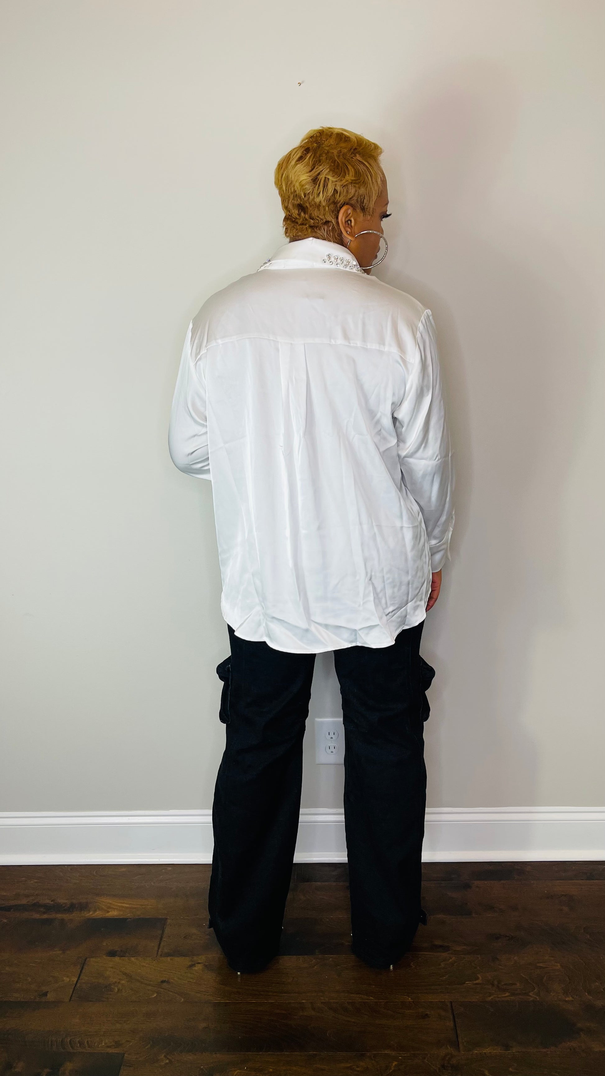 This top seamlessly combines a classic design with a touch of luxury. The satin like fabric is of mid-weight and fits oversized. Size down for a more fitted look. The rhinestone collar elevated this timeless stable, making it the perfect statement piece for your wardrobe.