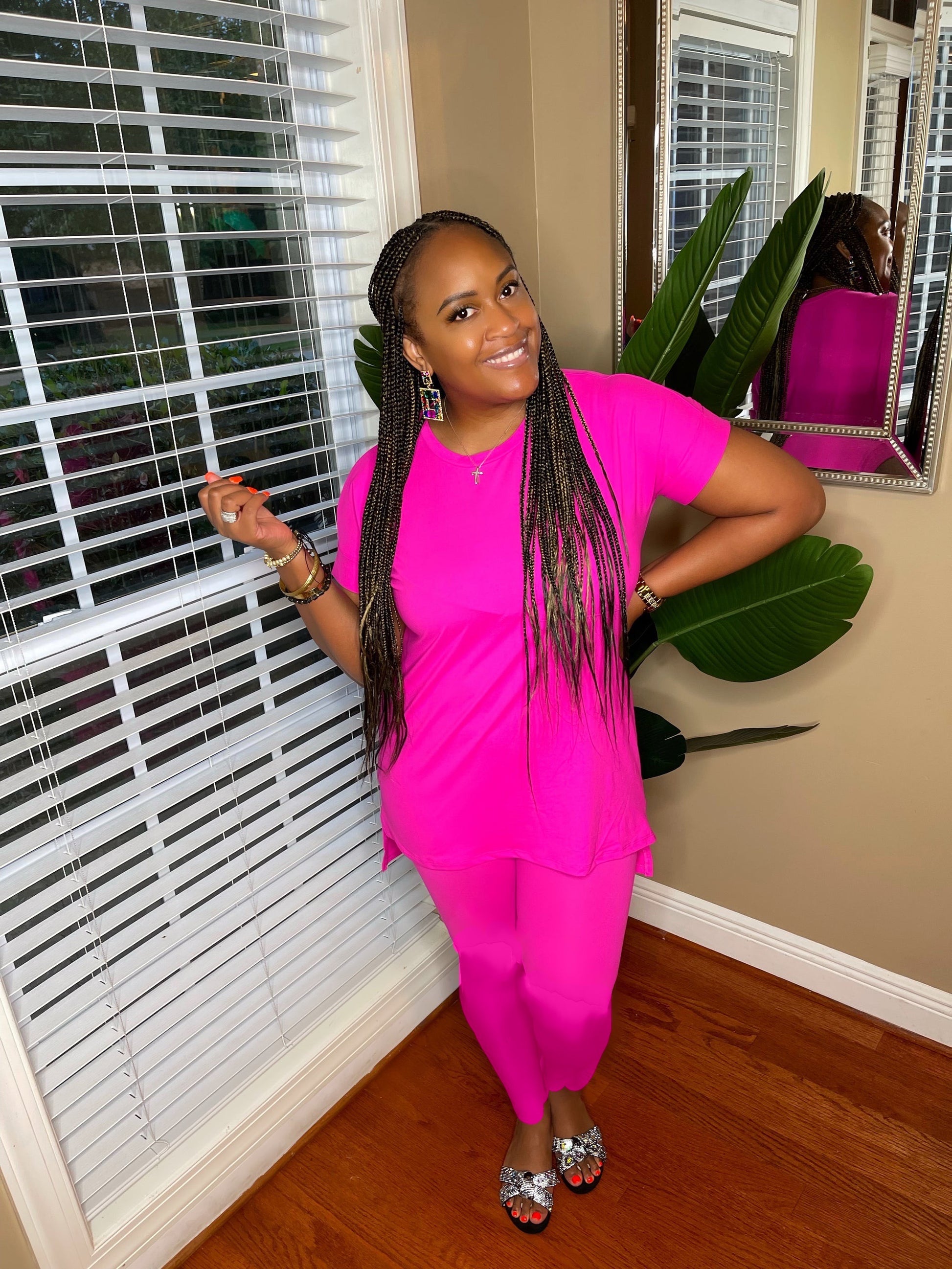 Microfiber loungewear two piece set. Leggings and v-neckline blouse with splits on the side. Fits slightly oversized for a comfortable fit. Set has lots of stretch. 90% polyester 10% cotton. Leggings fit high waist. Model is wearing a size small.