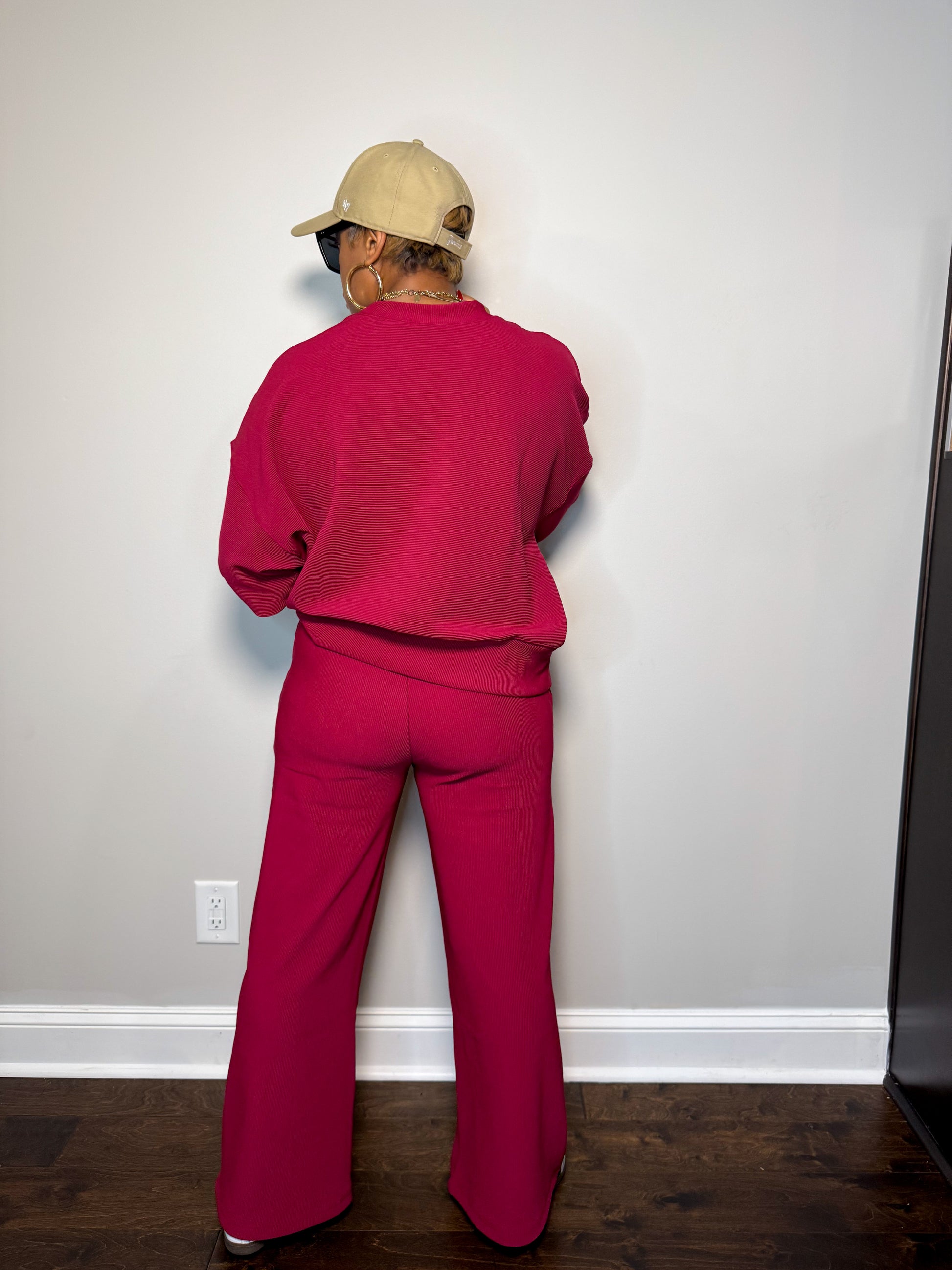 Wine Ribbed Lounge Set | Oversized Top & Wide Leg Pants